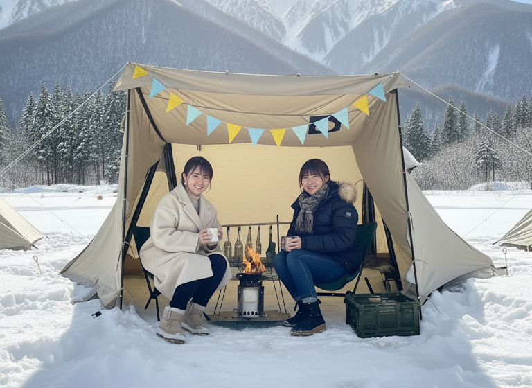 「パップテント」と「焚き火道具一式」で楽しめる。寒いからこそ心まで温めてくれる焚火と共に過ごす時間は格別です!炎の揺らめきを見つめながらゆったりと憩いの時を過ごそう。